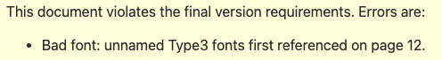 I recently had a small odyssey with PDF and fonts when preparing camera-ready versions of my two most recent papers. It started with the following error message from HotCRP format checker: “Bad font: unnamed Type3 fonts first referenced on page X”.