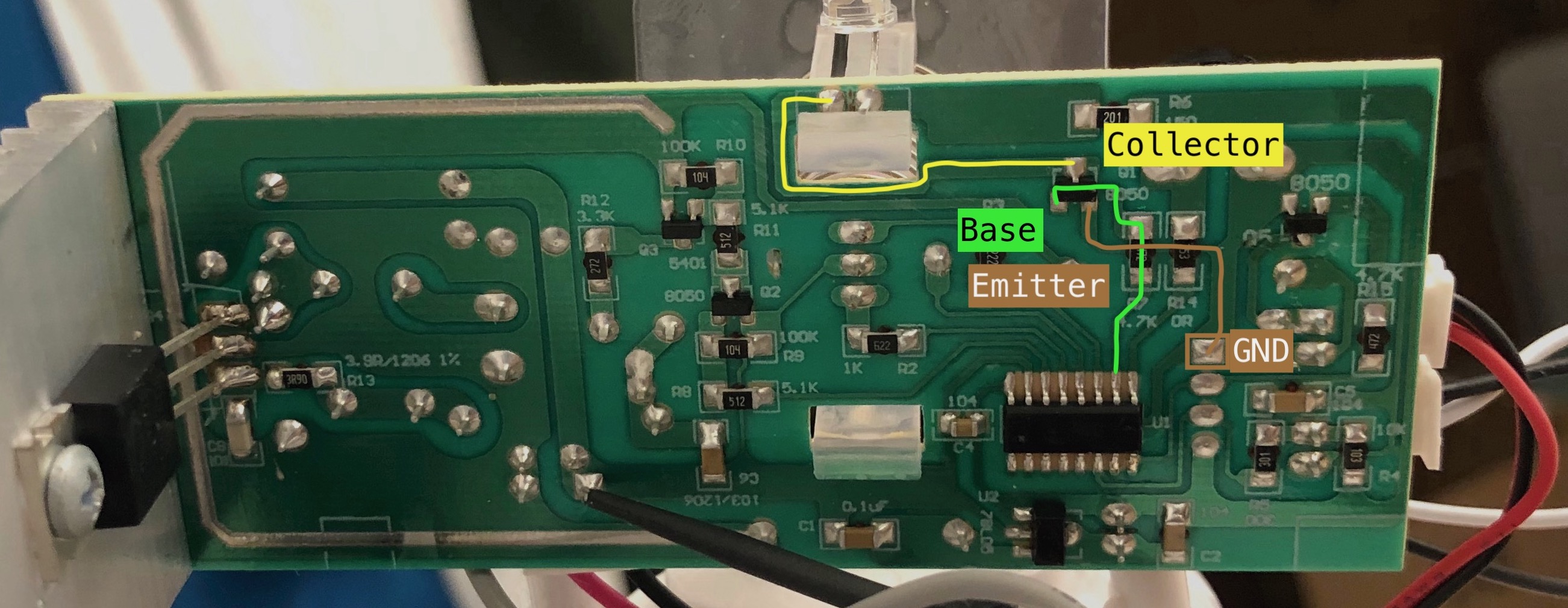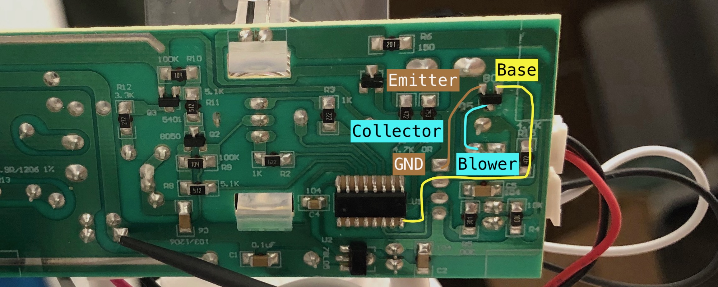 The blower was similarly controlled through a BJT, so locating the pin on the MCU was a breeze now that we know how to deal with NPN BJTs.