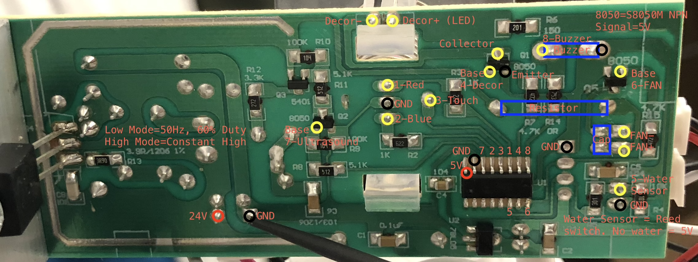 The first step of this project is to figure out how the humidifier (especially the mist-making diaphragm) is controlled, i.e., we want to reverse engineer the device. I have some basic knowledge of my humidifier: there is a touch sensor (likely capacitive) that acts as a electronic switch. Two LEDs: one indicates the state of the device (solid blue is on, flashing red is low water), and the other is a decoration that turns on in certain modes. A water level sensor that is likely to be a Reed switch. There should also be an MCU that processes sensor signals and controls the diaphragm.