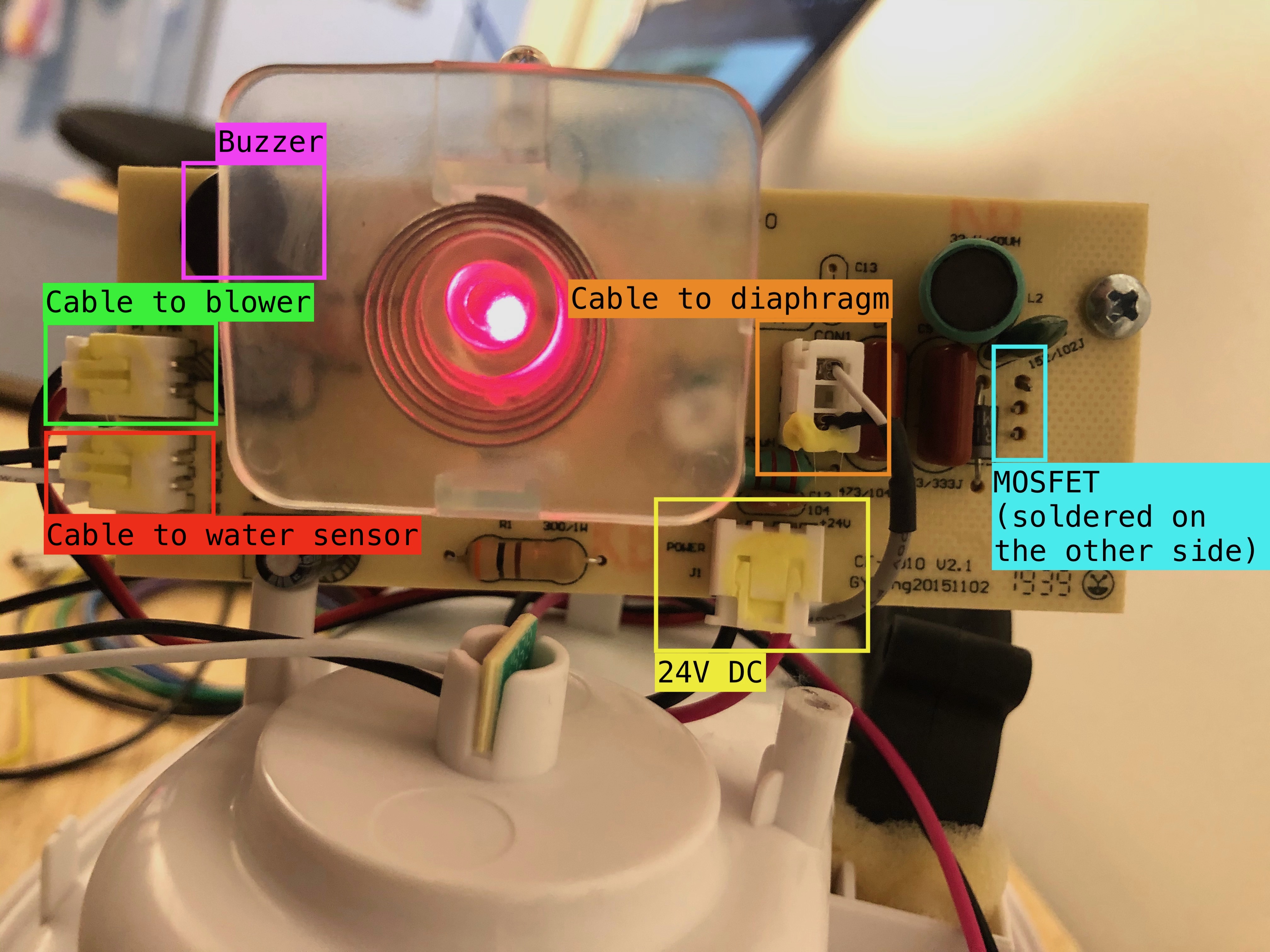 The parts that I anticipated to exist are all there. In addition, there is a blower that blows out the mist. There are some pretty hefty components (mostly capacitors and resistors) on the yellow side of the PCB. To my surprise, there is an oversized heat sink attached to a big component that looks like a MOSFET. The MOSFET, most of the big components, 24V DC input, and a cable leading to the diaphragm share one half of the PCB which supposedly handles high-power and high-voltage (24V) stuff. The blower, the water sensor, and the buzzer share the other half of the board.