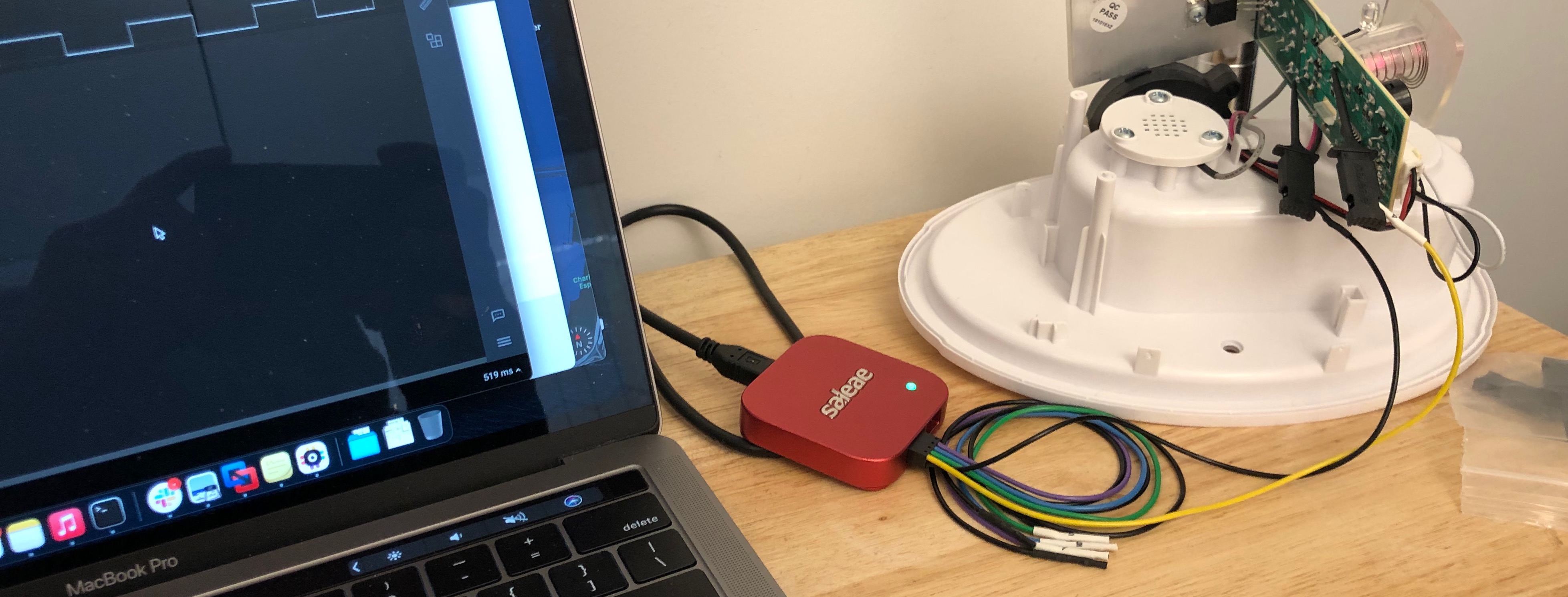 I guess this mechanism works by letting the MCU continuously measure the capacitance of the spring and trigger an event when a change is detected. However, I do not have a more concrete understanding beyond that. Since my goal is to find a way to let my Raspberry Pi take over the control, I wanted to know if there is an easy way for the Raspberry Pi to generate a signal which would be registered as a touch. If so, I can use it to fake touches on the switch and remotely control the humidifier while treating the humidifier as a black box. So I set up my logic analyzer, a Saleae Logic 8.